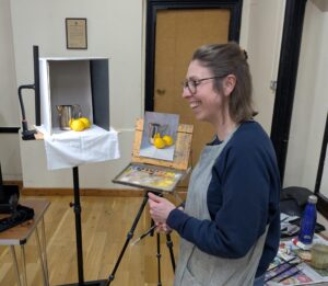 On Tuesday, 17th March, 19.30 – 21.30, artist Catherine McVean gave a live demonstration on painting a still life with silver surfaces.