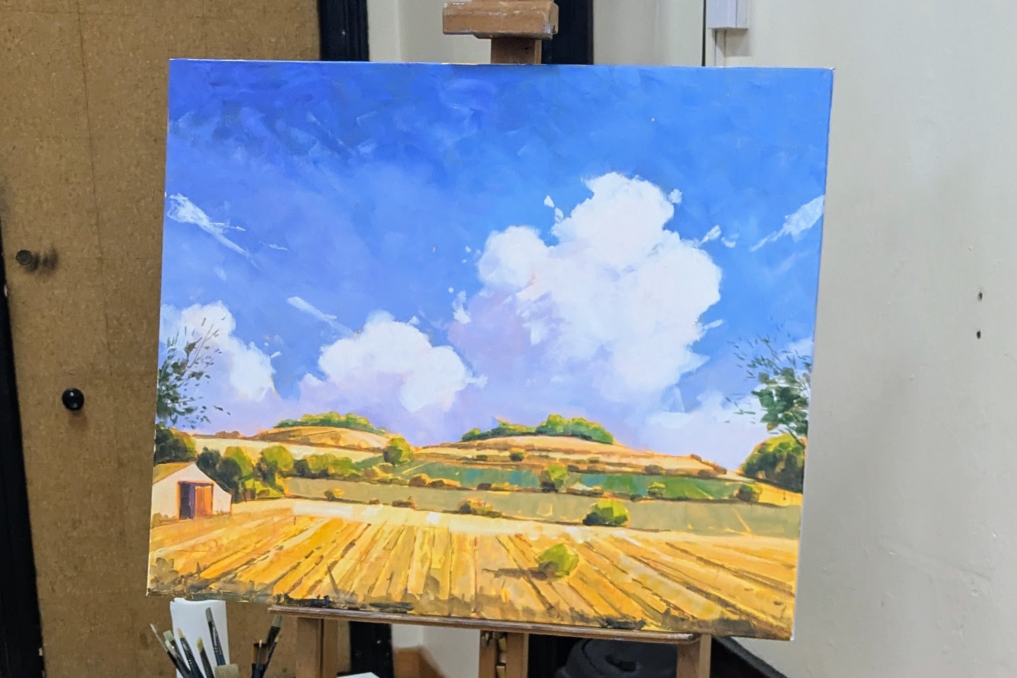 He added in a tractor shed on the left (enlarging it for interest from the photo) with a white front, and a red oxide (rusty) door ajar. He worked on the bases of hedgerows, adding darker tints throughout to ground them.