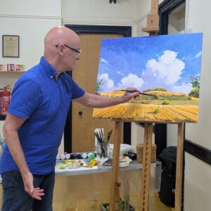 When asked how he knows he has finished, he says he stands back, looks around the painting carefully and if after 30-45 seconds of scanning, he can’t find anything that feels wrong, it’s generally done! Looking at his painting he said he would probably finish off by blending the top left area of sky better, add more white to the clouds to add movement and tighten up the bushes and hedgerows. He said that afterwards he may add grasses and his “trademark” cow parsley in the foreground to give perspective and further interest.