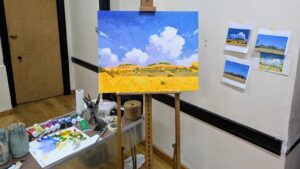 He started with a sketched-out composition, using burnt umber on a brighter cadmium orange and lemon yellow background. Working on the sky, he moved quickly from the top left to right, and top down in cerulean, and ultramarine blue, adding white to lighten it on the right where his light source was and on top of the Clumps. He added in clouds using white at the top with feathered edges and a few wispy contrails, and blue grey (using violet not black) at the bases. He was happy to let the yellow base show through a bit in places where the sun source was the strongest.
